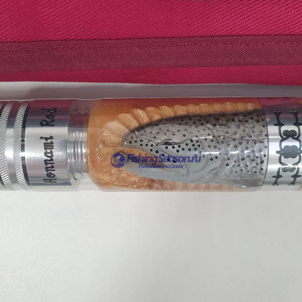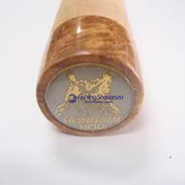 Рукоятка спиннинга, выполненная из португальской пробки ААА премиум класса, отличается своей высокой чувствительностью. Верхняя часть рукояти оформлена янтарем, а нижняя часть со вставкой из ценных пород дерева с изображением филина на торце. Надежный катушкодержатель класса премиум с инкрустацией изображения лосося также выполнен из ценных пород дерева.